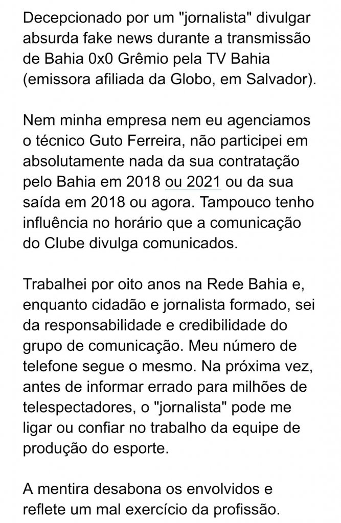 "Decepcionado por um "jornalista" divulgar absurda fake news durante a transmissão de Bahia 0x0 Grêmio pela TV Bahia", declarou na nota. "Nem minha empresa nem eu agenciamos o técnico Guto Ferreira, não participei em absolutamente nada da sua contratação pelo Bahia em 2018 ou 2021 ou da sua saída em 2018 ou agora. Tampouco tenho influência no horário que a comunicação do Clube divulga seus comunicados", completou.