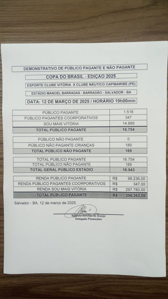 Nesta quarta-feira (12), em duelo válido pela 2ª fase da Copa do Brasil, o Vitória perdeu para o Náutico por 2 a 0 e se despediu da competição. No Barradão, 16.943 torcedores estiveram presentes para uma renda de R$ 369.363,00.