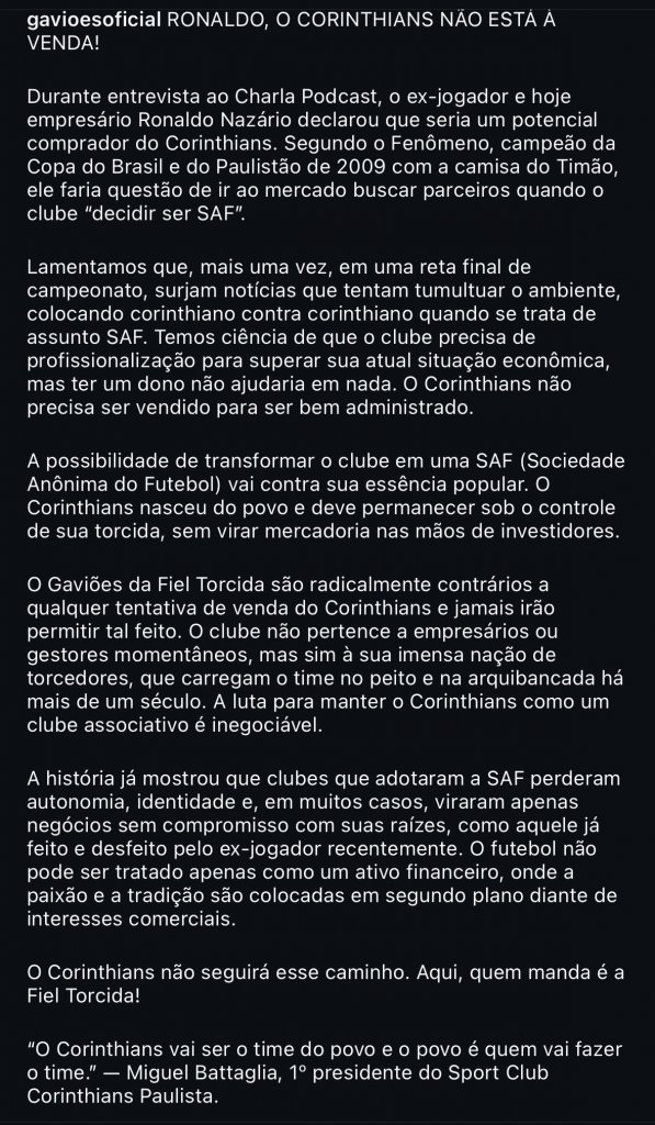 A organizada também criticou a transformação de outros clubes em SAF, afirmando que perderam "autonomia e identidade" e se tornaram apenas "negócios sem compromisso com suas raízes". A nota ainda menciona que temas como esse tumultuam o ambiente em um momento decisivo da temporada. Veja comunicado oficial completo: