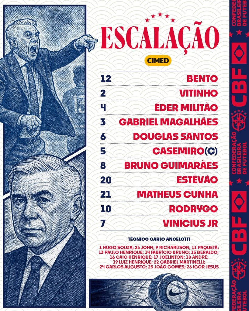 Já Carlo Ancelotti aposta em um Brasil bastante ofensivo, com quatro atacantes. A Seleção entra em campo com: Bento; Vitinho, Éder Militão, Gabriel Magalhães e Douglas Santos; Casemiro e Bruno Guimarães; Vinícius Júnior, Matheus Cunha, Rodrygo e Estêvão.