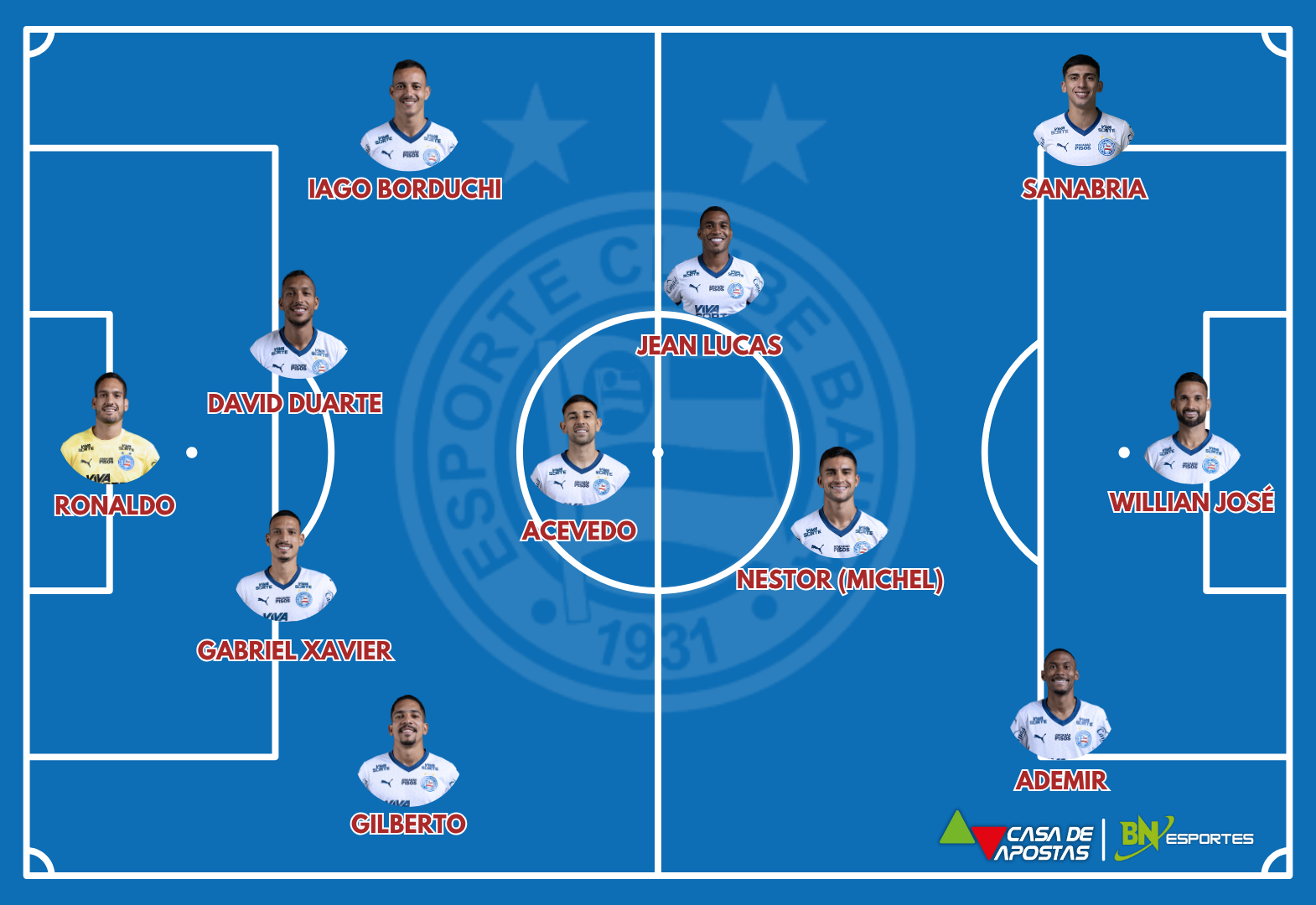Bahia: Ronaldo; Gilberto, Gabriel Xavier, David Duarte e Iago Borduchi; Acevedo, Jean Lucas e Nestor; Ademir, Willian José e Sanabria. Técnico: Rogério Ceni.